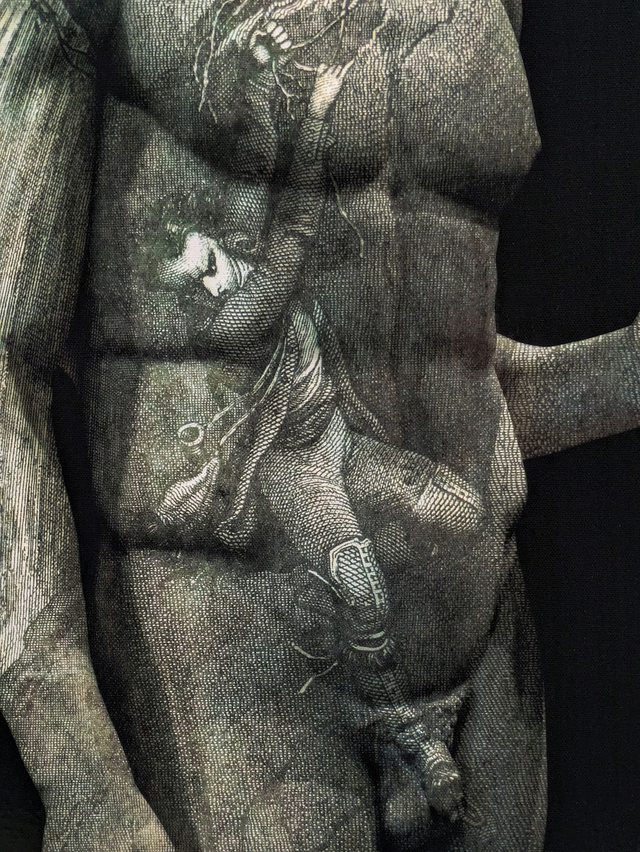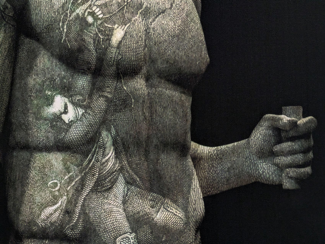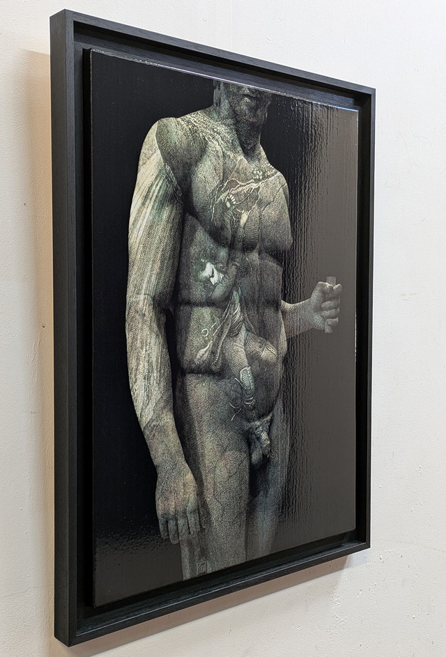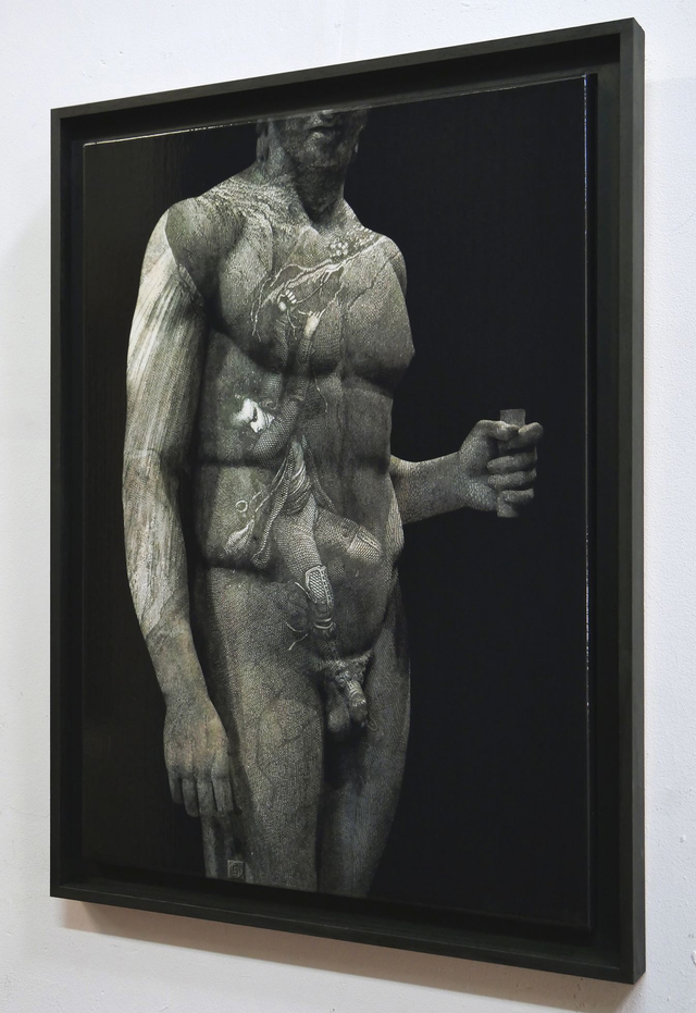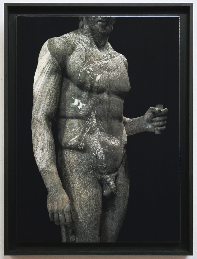 Ce nu masculin appartient à une série intitulée "Palimpsestes" qui fonctionne sur le principe du dialogue entre deux techniques et deux temporalités différentes. Ici, il y a à la fois une sculpture antique, photographiée dans un musée, nu masculin très classique avec un homme qui tient un fragment d'objet inconnu dans la main, et une gravure du 19e siècle qui montre un homme en train de tomber et qui évite la chute uniquement parce lui aussi tient une branche dans la main. C'est ce geste dédoublé d'un homme qui tient une branche dans la main qui donne son titre au tableau, qui signifie "branche du salut".